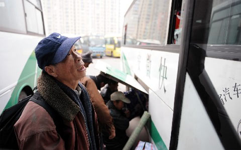 1月20日,旅客在合肥汽车客运总站准备上车回家。 据安徽公路客运部门预计,1月21日起,安徽省将迎来农民工返乡客流高峰。1月23日前后,回家探亲客流和农民工客流明显叠加,届时将是节前公路春运客流最高峰。