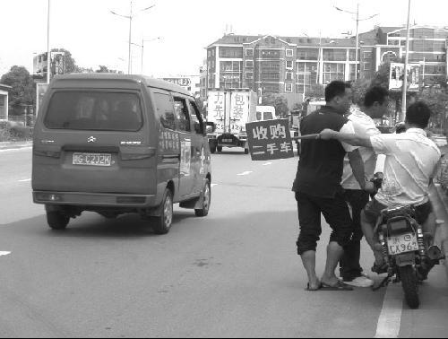 2009年6月4日上午,记者到位于望道路上的义乌二手车交易市场采访时,不时见到有人手持“收购二手车”的牌子在机动车道上招揽生意。