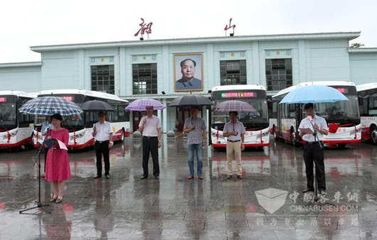 2015年6月8日,整装待发的14辆身批红花,干净整洁的新型电动公交车早早亮相韶山火车站广场。毛主席家乡——韶山迎来湖南省首条纯电动城乡公交线路1、2路的正式开通运营。湘潭及韶山的领导与多位市人大代表、政协委员及各界新闻媒体记者、市民一起乘坐并体验了该线路的首发班次。