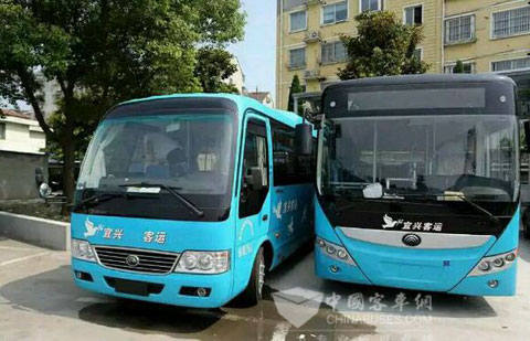 2015年7月20日,江苏宜兴市公路客运有限公司购置的首批22辆纯电动公交车顺利完成交付,正进行最后的调试。2015年7月底前,这批新型环保公交车将在高铁专线公交396路,高塍南新线公交233路、洋岸线公交211路及张渚镇村公交班线等线路率先上线运营。这是无锡地区首次引进纯电动公交车。