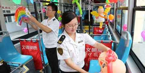 2015年8月18日上午,记者在车站看到了这辆名为“七夕”主题的公交车。“我们用彩色气球做了心形挂饰和丘比特图案挂在车内、车外。”工作人员舒金美一边绑着气球一边说。为了迎合七夕节浪漫唯美的气氛,工作人员特意将车辆用五彩缤纷的气球装饰起来,包括时下最流行的魔术气球,看似简单的车头装饰需要5个人花费1个多小时制作。