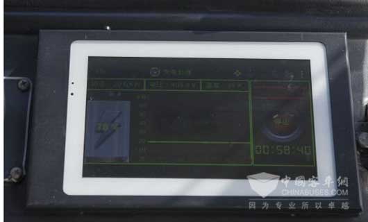 “你看,如果正常充电,在司机左手边设置的平板电脑上,就会显示出功率、电压、温度、电池充电情况、已经充电时间等多个数据,而且是一键开关非常方便。”刘队长上了一台车,开始给记者介绍起来。