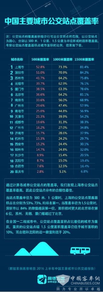 当站点覆盖半径为500米、1公里时,上海的公交站点覆盖面积占比分别为53%、73%,均排名第一;当覆盖半径为1.5公里时,深圳市以84%的数值越居第一位。尽管北京市的公交站点数量和线路数量均是全国最多,但由于其面积相对更大,站点覆盖率只排在第6位,苏州、无锡、厦门都超过了北京。