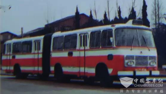 1983年SK--562G铰接式可控硅电车 随着城市交通的发展,上世纪60年代,上海引进了一批两节车厢的大容量铰接式公交车,车身长度是最初单机公交车的两倍,增加了车辆的乘客乘载量。