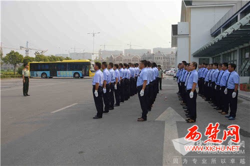 2016年7月29日,在克拉嗨谷公交调度站,宿迁公交委托市武警支队官兵对301路“红旗车队”驾驶员进行岗前军训。