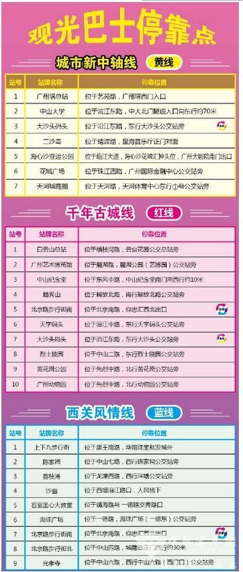 路线:从白云山总站出发,途经中山纪念堂、越秀山、北京路步行街南、天字码头、大沙头游船码头、烈士陵园、黄花岗公园、广州动物园,再回到白云山总站。