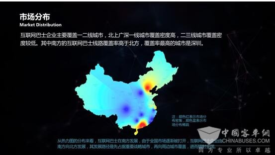 目前,全国范围内的互联网巴士企业主要覆盖一二线城市,北上广深一线城市覆盖密度高,其他二三线城市覆盖密度较低。其中南方的互联网巴士覆盖率高于北方,覆盖率最高的城市是深圳。