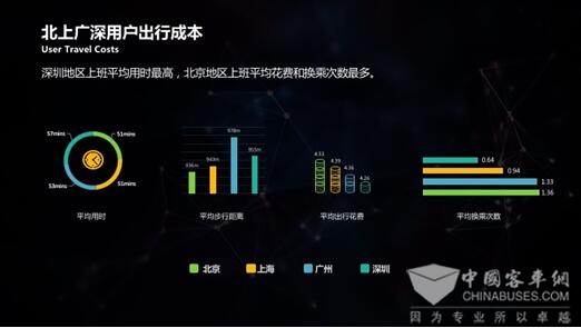 四、北上广深一线城市相比较,深圳地区白领上班平均用时最高,北京地区上班人群平均花费和换乘次数最多。