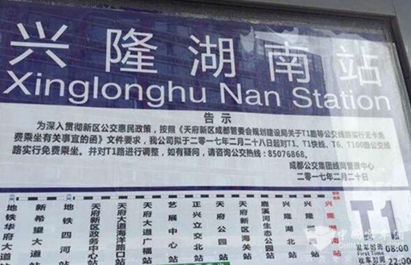 从2017年2月28日起,成都公交集团对T1,T1快线,T6,T100路公交线路实行无卡免费乘坐。