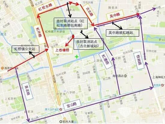 其中上岙塘桥最为复杂,施工期间采取半幅封闭半幅通行的施工方案,东向西方向正常通行;而西向东方向禁止所有车辆通行,途经车辆可参照下图所示线路进行绕行:虹许路→红松东路→古北路→吴中路(红色线路);莲花路→宜山路→虹漕路或者桂林路(紫色线路),另外公交线路也将改道。