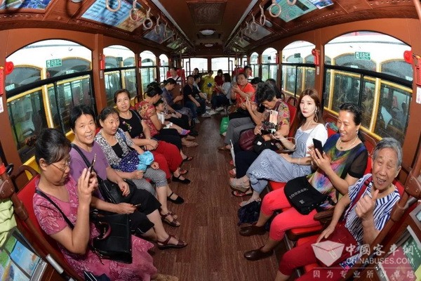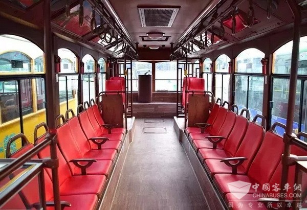 车窗也设计为别致的弧形,车内暗色地板与棕红的皮座椅相互衬托。搭配怀旧顶灯、别致的手环,车尾还专门保留了有轨电车的仿古操作舵等,方便游客“拍照打卡”。