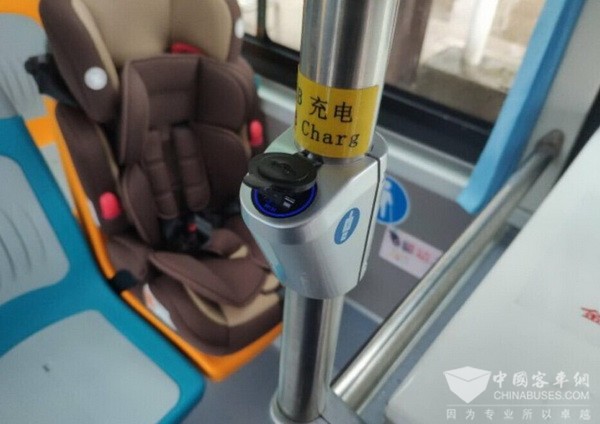 这辆土豪金色系的公交车,乍一看,还以为是BRT车,但仔细瞧瞧,身形短小多了,它就是今天正式上线运营的纯电动公交车。 车厢里,和传统公交车车厢相比,增设了5个充电装置,每个充电装置还有2个usb接口,方便大家在乘车的时候手机没电可以充电,车上还有温馨的哺乳专座设施,帘子放下来就有比较私密的空间可以受乳;还设置有儿童安全座椅,比较小的孩子乘坐就会更加安全。整条线路共有10辆纯电动公交车,这批纯电动公交车最大的特点就是零污染,车内空间也比传统公交车宽敞许多,没有异味儿和噪声,车辆运行也相对平稳,安全系数也高很多。8路公交车已经运营31年,不少老金华对它都很熟悉,首批纯电动车投放在8路公交线路,也是让更多的市民可以感受到更舒适的乘车体验。