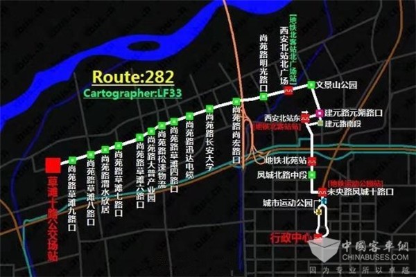 282路线路:由尚苑路草滩十路发车,经尚苑路、元凤二路、建元路、元朔路(回)、规划路(去)、元光路、凤城北路、凤城十路、未央路至行政中心。