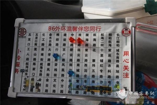 “我和车队同事们发明自制的这个到站提醒板,得到了车队领导的大力支持。从本月1号开始,在我车上正式进入试用期。根据这几天的观察,效果不错!我和对班为13名乘客提供了到站提醒服务。”B6路车长王彦宏说。