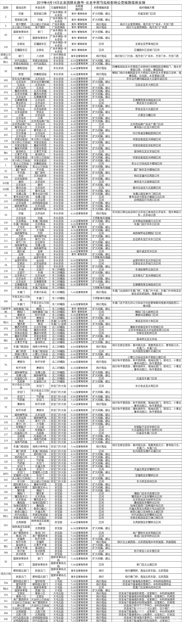 本次半程马拉松比赛起点设在天安门广场内,终点设在奥林匹克公园庆典广场。在交通管制时段内,途经赛事路段的73条公交线路将分时、分段、分方向采取临时运营措施。比赛期间,公交集团将在主要路口、路段及比赛影响区域设专人值岗,维持运营秩序,及时反馈路况信息,确保运动员通过后迅速恢复运营。