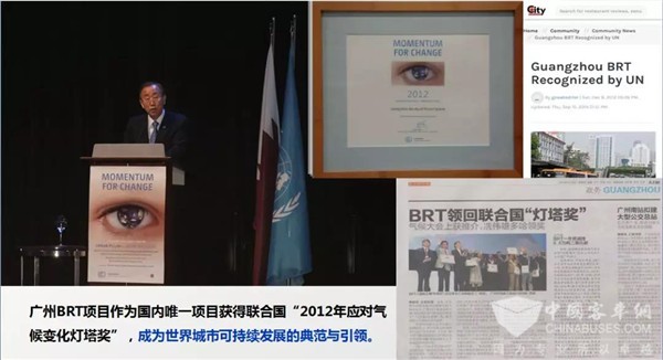 广州BRT在建成后由于社会影响显著,成果在联合国大厅、欧盟总部展出,获联合国气候变化框架公约秘书处等机构颁发的“应对气候变化灯塔奖”、世界可持续交通奖、快速公交金牌标准、绿色低碳等多项国际奖项。