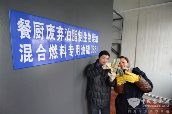 5月7日上午,上海久事公交集团与中国石化上海石油分公司在公交内江路停车场举行推广应用B5生物柴油启动仪式,向公交车油箱加注了“第一枪”B5生物柴油,由此,久事公交集团下属5家营运公司2000余辆公交车将“喝上”新“口粮”。这标志着上海市政府倡导的蓝天碧水工程迈进实质性一步,打通了餐厨废弃油脂资源化规模利用的“最后一公里”。