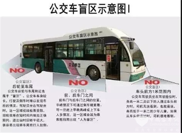 公交车驾驶员通过后视镜察看时,车后为全盲区。公交车体积大,虽然有影像仪,难免有时会顾及不到。儿童千万不能站在公交车后玩耍,行人与公交车尾部也应至少保持3米以上的安全距离。