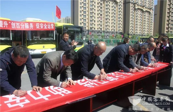 在活动现场,公交集团班子领导以及经营四部的驾驶员们参加了宣誓仪式并在承诺书上签字,承诺做到三个百分百,即”百分之百做到进站车速降至20公里/小时以下,路口、拐弯车要百分之百降速至30公里/小时以下,百分之百做到斑马线上必须停车礼让行人。”