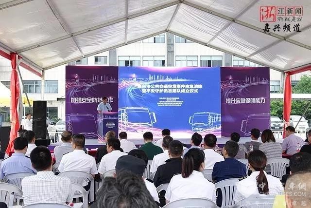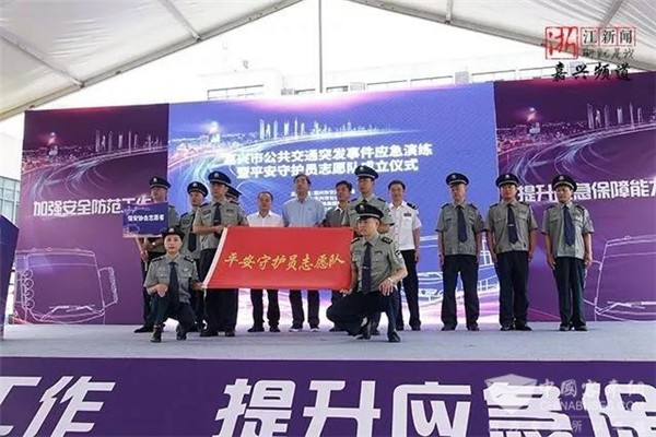 2019年6月25日上午,由浙江省嘉兴市交通局、市公安局、嘉通集团主办,市公交公司承办,市见义勇为基金会协办的嘉兴市公共交通突发事件应急演练暨平安守护员志愿队成立授旗仪式活动,在嘉兴市公共交通有限公司公交停车东场举行。
