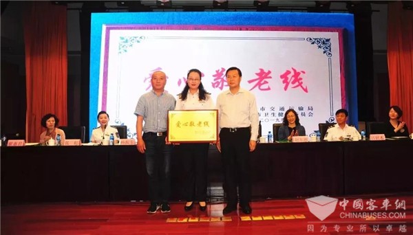 在众多征名方案中,“爱心敬老线”品牌名称经专家评委讨论表决后脱颖而出。6月10日上午,在烟台市卫健委举办的全国首个“老年健康宣传周”活动上,市卫健委、市交通运输局运输服务中心、公交集团向2路公交线授牌。