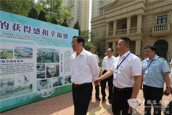 在金柳路客运站,代表们饶有兴趣地观看了《大连公交——百姓出行的首选,城市文明的窗口》展板,考察了大连市新能源车推广、充电桩建设、多样化服务模式、基础设施建设、维保现场、区域调度中心和基层职工从业、生活保障等相关情况。代表们进维修车间、大讲堂、调度指挥中心、党员活动室、职工休息室、活动室、更衣室、洗澡间,一路走来,王明玉给予高度评价。他说,大连公交基础设施真不错,职工们娱乐休息场所齐备,说明大连市和公交集团都非常重视。他还亲切接见了集团公司的劳模先进和党员包车组代表,与隋磊、唐学新、黄有亭、王永军、王超、刘伟、李世才、李亚文、高杰、吕晓波等一一握手,并合影留念。他满怀深情地说,你们是大连最美丽的一张名片,劳动创造了大连的美好环境,劳动给百姓带来了安全,劳动最光荣。在此,我代表省政府和省交通厅的同志们,对你们取得的成绩表示祝贺,对你们过去所付出的努力和辛苦表示慰问和感谢。祝你们在各项工作中取得更大的成绩,并祝你们身体健康,为全市市民和广大乘客做出更大贡献。