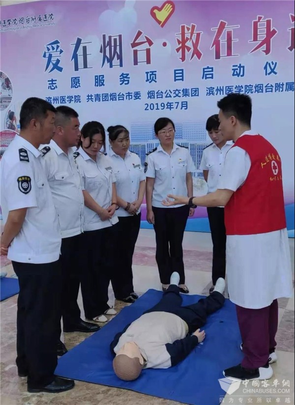 据了解,“爱在烟台·救在身边”志愿服务项目于今年4月14日,在烟台市青年志愿服务风采展示大会上获批发布。在烟台团市委的指导支持下,滨州医学院、烟台市公交集团、滨州医学院烟台附属医院经过3个月的紧张筹备,拍摄了公交救援的医疗科普视频、对公交司乘人员进行了应急救援培训。
