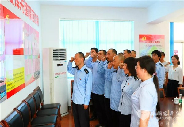 在杨军的带领下,参会党员举起右手,面对鲜红的党旗庄严宣誓,重温了入党誓词,再一次表达了对党忠诚,奉献岗位,为公交事业奋斗终生的决心和信念。