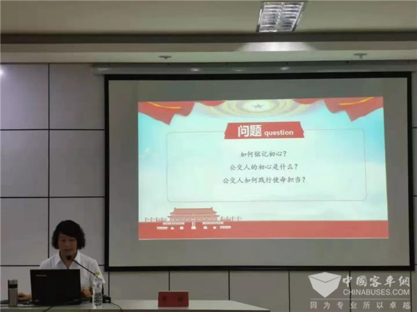 开班仪式结束后,干线公交党委书记李琳为大家上了一堂生动的党课。课程主题是“党旗引领悟初心,担当使命向前进”,围绕“如何铭记初心、公交人的初心是什么、公交人如何践行使命担当?”三个问题展开,讲述了“中国共产党成立背景;党旗引领,铭记初心;公交芳华,常念初心;担当使命,践行初心”四部分内容。期间,无数精彩视频让人热血沸腾,众多红色故事令人精神振奋,当所有在场党员在李书记的带领下郑重地举起右手,激昂地宣读入党誓词时,培训现场的气氛达到了高潮。通过重温入党誓词,学员们再次接受了精神洗礼,牢记了初心使命,时刻谨记共产党员的责任和担当。