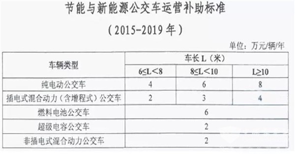 在2015年财政部、工信部和交通部联合下发的文件中,明确了新能源公交车的运营补助,2015年至2019年期间,中央财政对达到新能源公交车推广目标的省份,对已购买上牌、车型纳入工信部“新能源汽车推广应用工程推荐车型目录”、年运营里程不低于3万公里(含3万公里)的新能源公交车以及非插电式混合动力公交车,按照其实际推广数量给予运营补助。