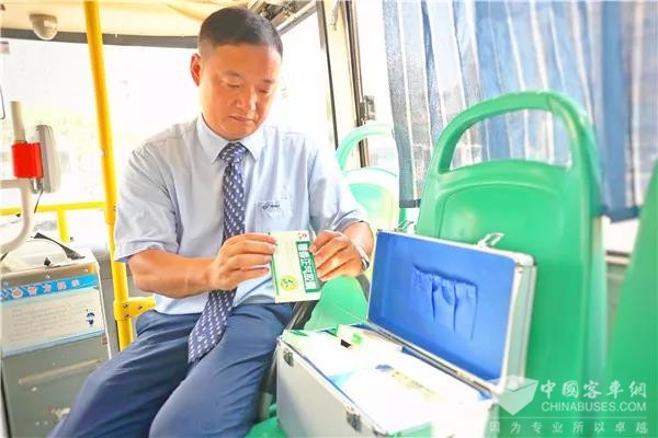 图为:驾驶员聂三华利用发车间隙清点便民箱内物品