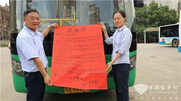 年过七旬的赵老夫妇乘坐739路公交车来到珞雄路公交场站,满怀感激地将手写感谢信交到线路负责人周平章手中,用这种方式表扬739路8名公交驾驶员15年来温馨热情服务乘客的感人事迹。耀眼的红纸黑字,字里行间都透露着老人情真意切的感谢。