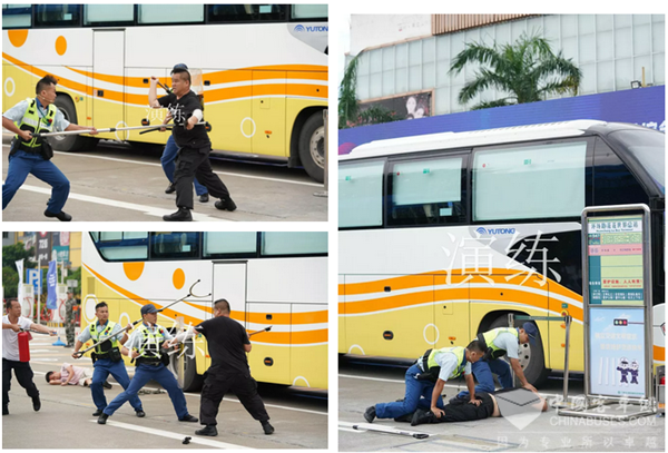 现场进行了公交总站遇暴恐人员袭击、公交车发现可疑人员、公交车发生抢夺方向盘、恶劣天气下车辆应急处置、公交车辆发生人员纵火事件、客运站旅客携带生化物品等应急处置演练等6个演练科目,以及常用消防应急器材设施使用示范教学、警棍盾牌操2个演示项目。