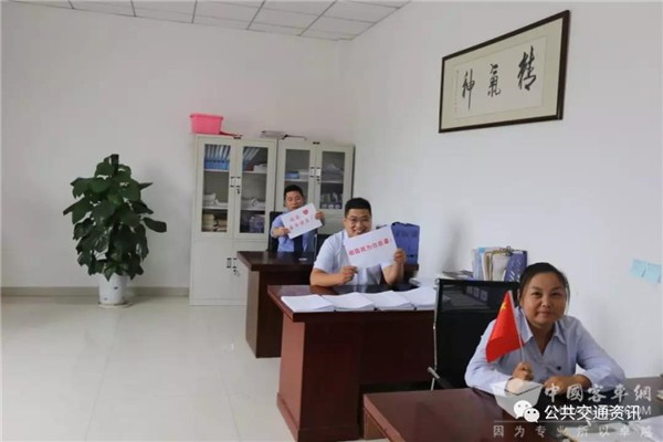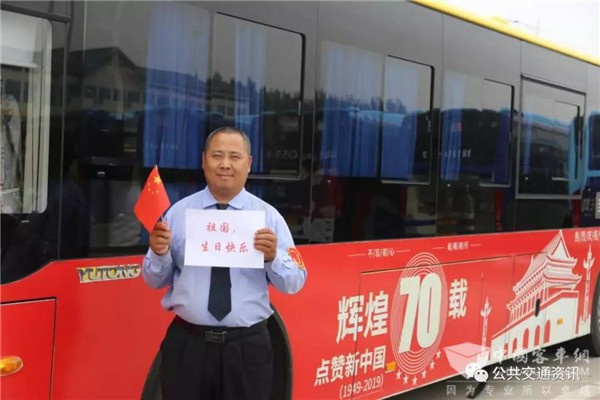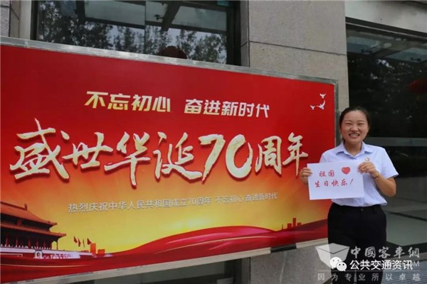 在宿迁公交公司301路“西楚清风号”及201路“红旗车队”车厢内,数面小国旗在车顶整齐悬挂,在一线站务室、驾驶员休息室、公交车厢前,来自公司各岗位的员工们,挥舞着小国旗,以向祖国送祝福的形式,将自己对企业对党对国家的热爱深深的表达。“祖国,我爱你!”“祖国明天会更好”“祖国生日快乐”“祖国我为你自豪”…一句句真诚美好的祝福体现了广大公交人献给祖国的生日贺礼。