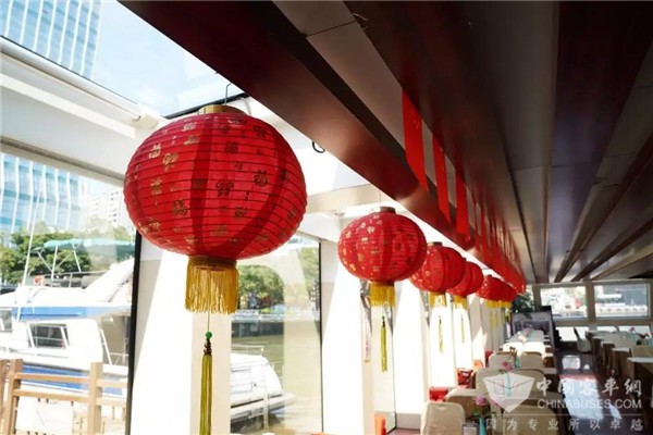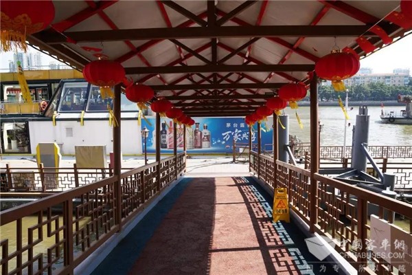 在天字码头,鲜艳的国旗迎风飘扬,珠江游船内也布置一新,整齐的挂出了国旗,一旁的大红灯笼也将船舱点缀得分外喜庆……