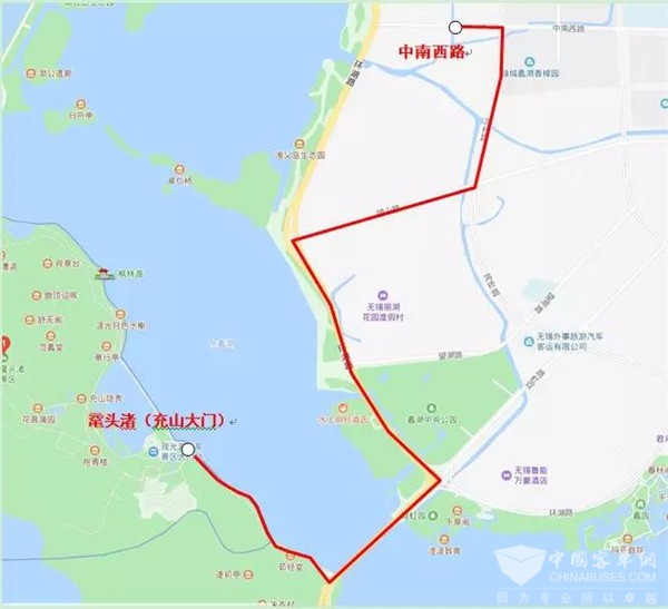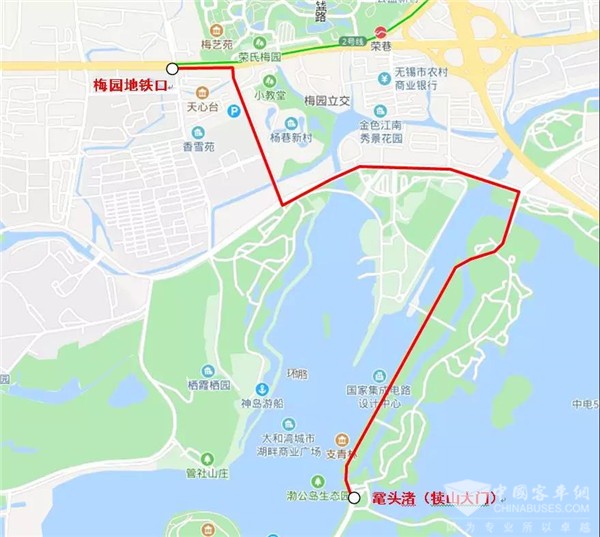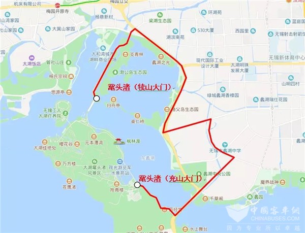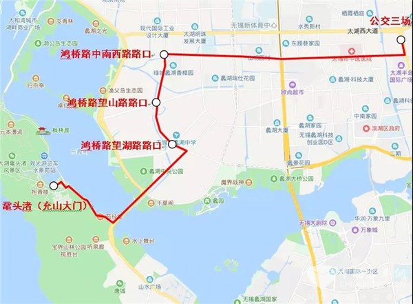 停靠站点:公交三场、鸿桥路中南西路路口、鸿桥路望山路路口、鸿桥路望湖路路口、鼋头渚充山大门。