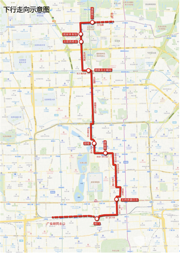 国庆假期夜景观光线路运营时间为10月2日至10月7日,下行由前门发出,途经王府井、锣鼓巷、鼓楼、北土城、北辰西桥北(水立方)至洼里南口,共设前门、王府井路口北、锣鼓巷、鼓楼、地铁北土城站、北辰西桥北、国家体育馆、洼里南口8站;上行自洼里南口,经北辰西桥北(水立方)、北土城、簋街、朝阳门至前门,共设洼里南口、国家体育馆、北辰西桥北、地铁北土城站、北新桥路口西、东内小街、朝阳门南、前门东8站。前门站发车时间为:18:00、18:20、18:40;洼里南口站发车时间为:20:00、20:30、21:00,单程票价10元。
