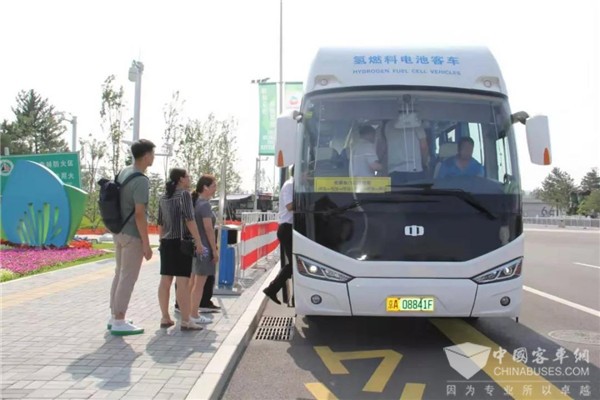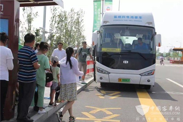 当晚,氢燃料电池客车分别驶入延庆8个乡镇,负责接送参加世园会闭幕式的群众,在实际运营中为人们带来氢能科普宣传,引发关注和热议。从2019年8月上旬起,已有两辆氢燃料电池客车在世园会园区周边区域为游客提供免费接驳服务,到目前为止已行驶超过2000车次,日均载客量达到200人次,接驳行驶总里程已达5500公里。