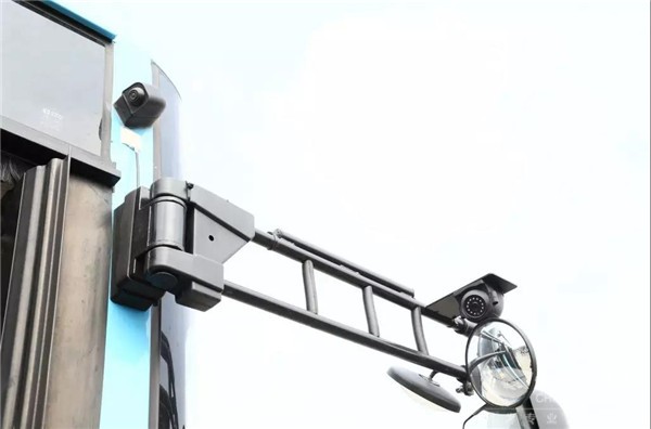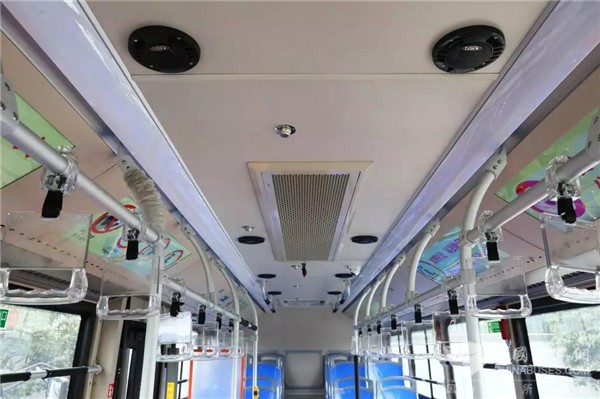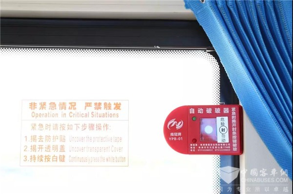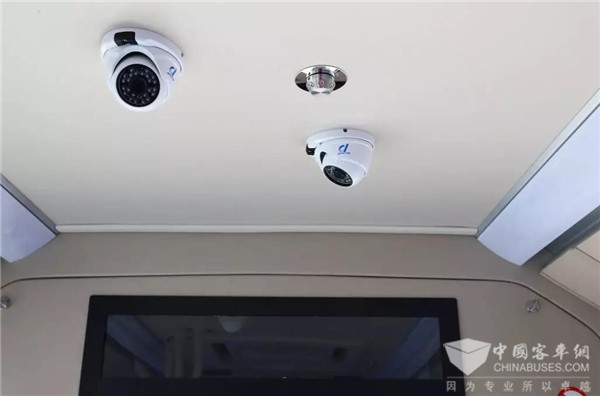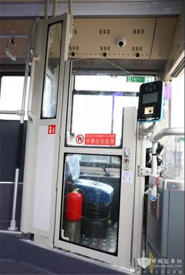 新型公交车与普通新能源公交车外形别无二致,只是在车体表面多了8个摄像头,由此组成360度全景环视系统,无死角地环顾四周。车内还安装了由7个喷淋头组成的灭火系统,每辆车配有一键破窗器,驾驶员座位处还安装有一个钢化玻璃的安全防护门,增设了一键报警按钮,大大增强了安全性与处理问题的及时性。