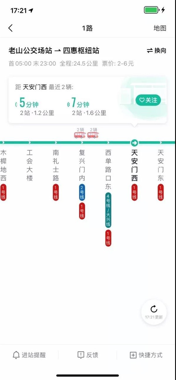 在出行过程中,北京MaaS平台开创性地引入了“公交/地铁乘车伴随卡”,将路线规划、步行导航、换乘引导、下车提醒等服务直观地呈现在使用者面前,还会根据用户的位置实时展示正在乘坐哪条线路、还剩几站换乘、剩余时间等,当用户即将到达目的地或者需要换乘时,还能贴心的提供“下车提醒”功能,为市民提供“门到门”的无缝出行引导服务。