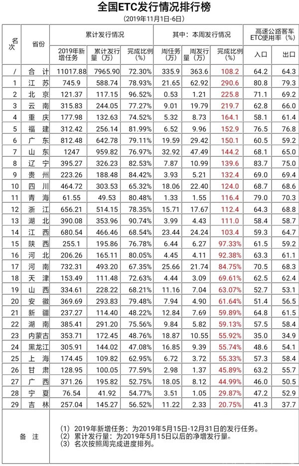 截至11月6日,全国ETC用户累计达到16033.58万,完成发行总目标19085.56万的84.01%。