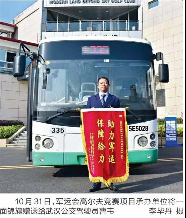 10月18日武汉军运会开幕,人民日报在当天的17版刊登了一篇题为《武汉,办出一届最赞的军运会》的重点报道。这篇报道分为“以军人精神冲锋在前”“以工匠精神保证品质”“以劳模精神勇担使命”等三大部分。让人印象十分深刻的是,在这篇报道的第三部分“以劳模精神勇担使命”中,专门写到了武汉公交——“湖北省劳模、武汉公交780路驾驶员李福斌说:‘服务好来自四面八方的每一位乘客,给他们留下对武汉美好的第一印象,就是我为军运会做的贡献。’军运会期间,他与武汉公交集团的千余名公交驾驶员、安全员、应急保障人员一起,参与开幕式和闭幕式的演职人员等的输送保障任务。这段时间,李福斌和同事们频频参加演练,已对输送线路、车辆运营时间、乘客人数等烂熟于心。为了给军运会外国观众提供优质、舒适的公交服务,李福斌还跟女儿学英语,每天在家练习军运会相关英语表达1个小时。”武汉公交相关负责人说,武汉公交是有着深厚历史积淀的老企业,一直都具有光荣的人文传统和为民服务的情怀。伟大出自平凡,平凡造就伟大。多年以来,武汉公交的先进模范一直层出不穷。包括李福斌在内,武汉公交的湖北省劳动模范、武汉市劳动模范、武汉五一劳动奖章获得者等数十位先进、模范,都是全程参与了此次军运会的公交服务保障任务当中。这些武汉公交的先模们带头奋发作为,不讲条件不打折扣,披星戴月甘于奉献,用恪尽职守与精益求精,为军运会期间演职人员、市民、观众和乘客的舒适、便捷的出行,贡献了一份“最美”力量。