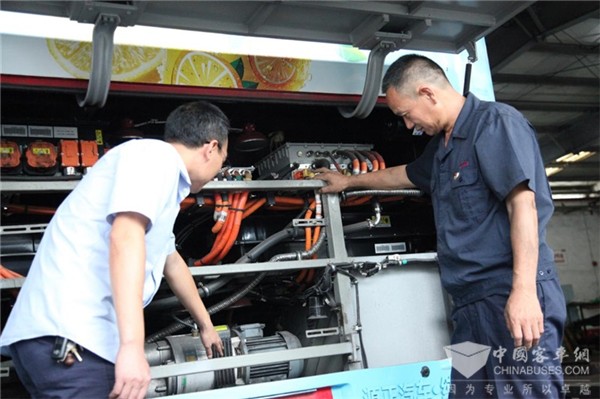 崔师傅说:“在纯电公交参与线路运营的初期,要学的东西太多了,电池系统这些构造对我们来说是一套全新的东西,可以说以往积累的维修经验很多已经用不上了。”很多结构设置是崔师傅闻所未闻的,需要厂家过来指导,在故障车辆前一边检修一边讲解,还不断的举例子或者做假设等,崔师傅等人就一边看一边问一边做笔记不断学习。