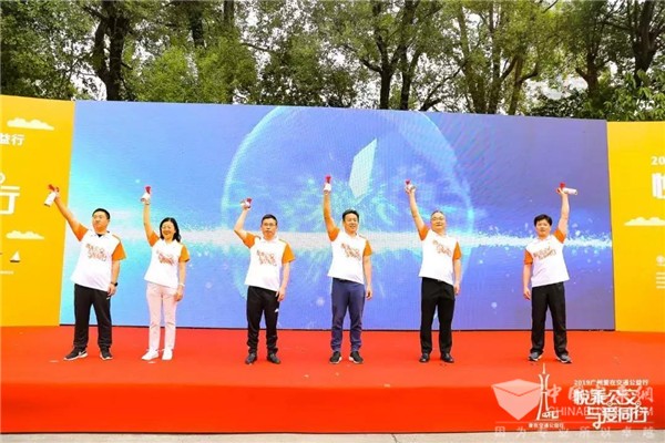 广州市交通运输局党组书记、局长潘双明,广州市公交集团党委书记、董事长陈万雄,广州市交通运输局党组成员、副局长何东海,广州市公交集团党委副书记谢伟秀,广州市慈善会执行秘书长、慈善服务中心主任张伟,广州市灯塔·爱在交通基金主任刘兵摁响发令汽笛,2019广州爱在交通公益行活动正式开始