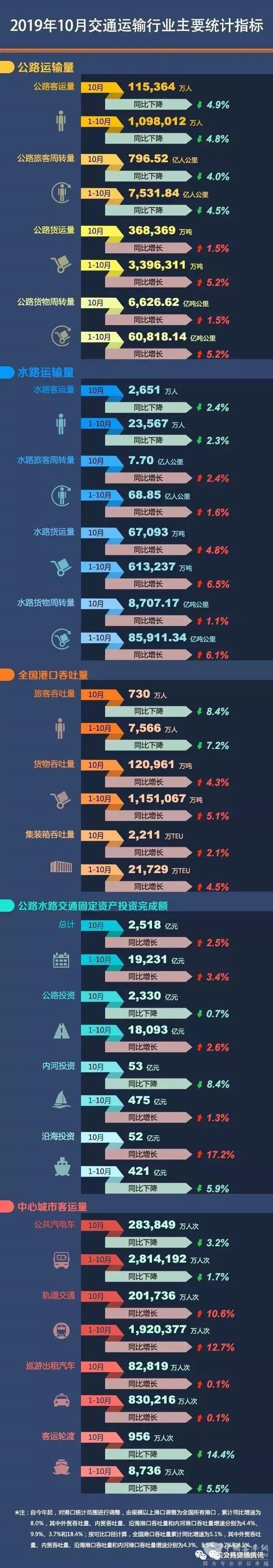 轨道交通:10月客运量201,736万人次,同比增长10.6%;1~10月客运量1,920,377万人次,同比增长12.7%。