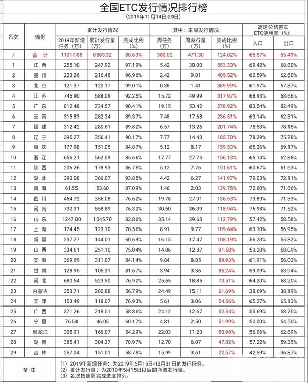 截至11月20日,全国ETC客户累计达到16951万,完成发行总目标19085.56万的88.82%。剩余发行任务2134.56万,日均52.06万。