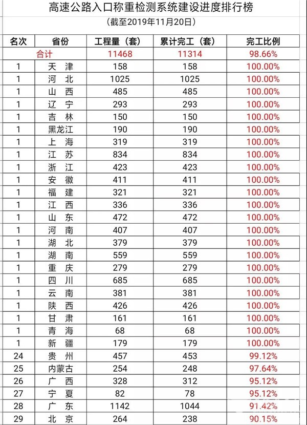 全国高速公路入口称重检测系统建设改造总计划为11468套。截至11月20日,累计完工11314套,占总计划的98.66%。29个联网收费省份中,有23个省份完工率达到100%,未全面完工的6个省份依次是:北京(90.15%)、广东(91.42%)、宁夏(95.12%)、广西(95.12%)、内蒙古(97.64%)和贵州(99.12%)。