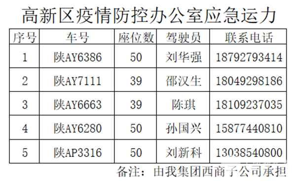 2020年1月30日,陕西交运集团被西安高新区新型冠状病毒疫情防控指挥部抽调,成为该区疫情应急保障车队。次日凌晨00:50分,接到高新区疫情防控指挥部电话通知后,5台车辆及驾驶员按疫情指挥部要求,在30分钟内迅速集结完毕。