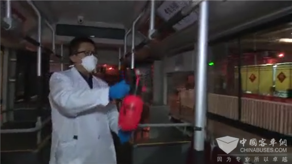 每天需要对车辆的各个扶手的位置、投币箱、刷卡机、车门、行李架、然后开阔的空间位置,车上的清洁筒,还有车内的比较开阔的空间位置,都需要有消毒的操作。然后每辆车消毒工作完成了以后,都要做相应的记录工作。”
