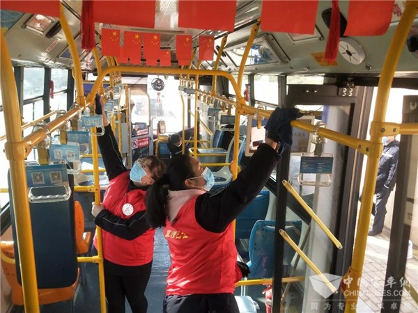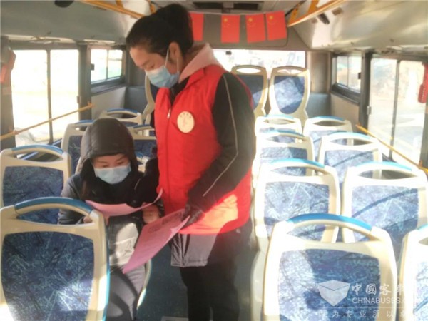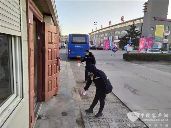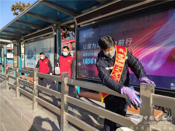 一组人员来到了阜安景苑车站、中国人保财险车站和科技大学车站,向乘车市民发放疫情防控倡议书,倡导减少外出次数、佩戴口罩出行。另一组人员携带消毒液走进公交车厢、职工休息室、场站、公交站台等场所对车辆扶手、地板、公交站台栏杆和职工工作休息场所进行消毒防疫。